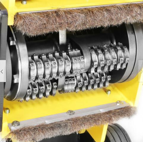 The small concrete milling machine adopts the opposite working principle of the reverse cutting of the large milling machine. The small concrete milling machine relies on the positive high-speed rotation of the milling drum to shake several groups of hard tungsten steel alloys on the cutter shaft of the milling drum. The blade hits the ground at high speed, and the tungsten steel alloy teeth on the alloy blade are used to crush and grind the ground material, so as to achieve the surface milling treatment effect.