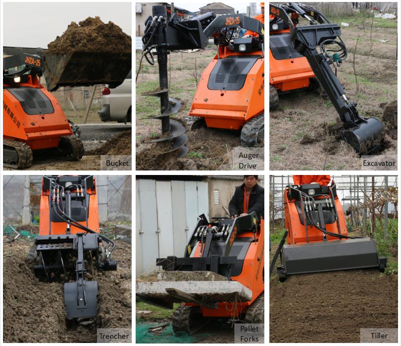 Mini skid steer loader allows you to pair it with many attachments you may already own and use, while one loader can for various function. JIEHE mini-skid steer loader can attach different attachments, such as bucket, excavator, auger, trencher, hydraulic breaker, pallet forks, tiller, 4 in 1 bucket, wood chipper, root grapple and so on.That means your Mini Skid Steer can quickly become a Mini Excavator, Mini Backhoe, Mini Sweeper, Mini Tiller or Mini Trencher. To ensure that the work you might do has an attachment to complete. This machine is also the perfect solution for contractors looking for that one piece of equipment that makes financial sense and offers an advantage over competitor.