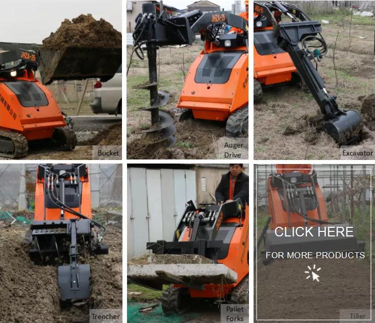 JIEHE mini-skid steer loader can attach different attachments, such as bucket, excavator, auger, trencher, hydraulic breaker, pallet forks, tiller, 4 in 1 bucket, wood chipper, root grapple and so on, to ensure that the work you might do has an attachment to complete.It is especially suitable for the operation of narrow areas such as garden, farm, urban infrastructure, road or construction site, workshop, warehouse, wharf, ship deck and even cabin,underground construction tasks.
